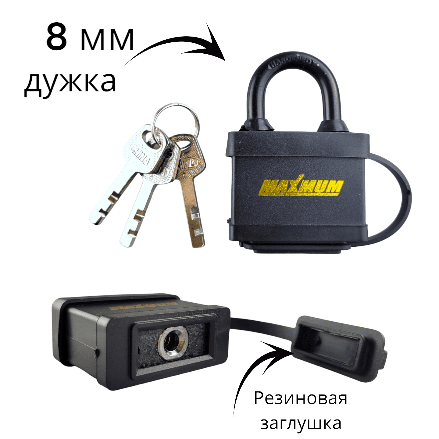 Корпус стального замка имеет резиновые покрытие в местах входа дужек и ключа.